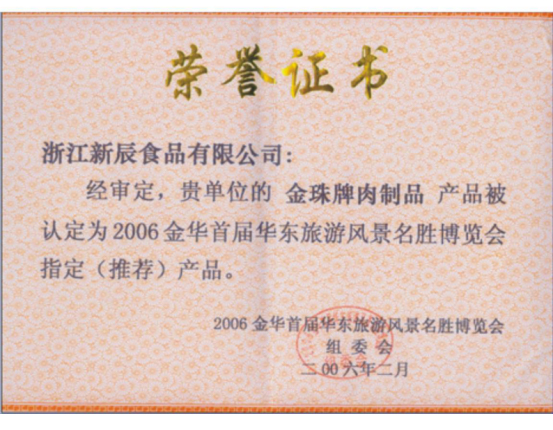 金珠牌肉制品產品被認定為2006金華首屆華東旅游風景名勝博覽會指定(推薦)產品。