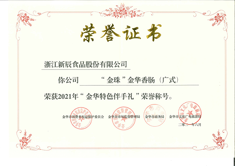 “金珠”金華香腸(廣式)榮獲2021年“金華特色伴手禮”榮譽稱號。